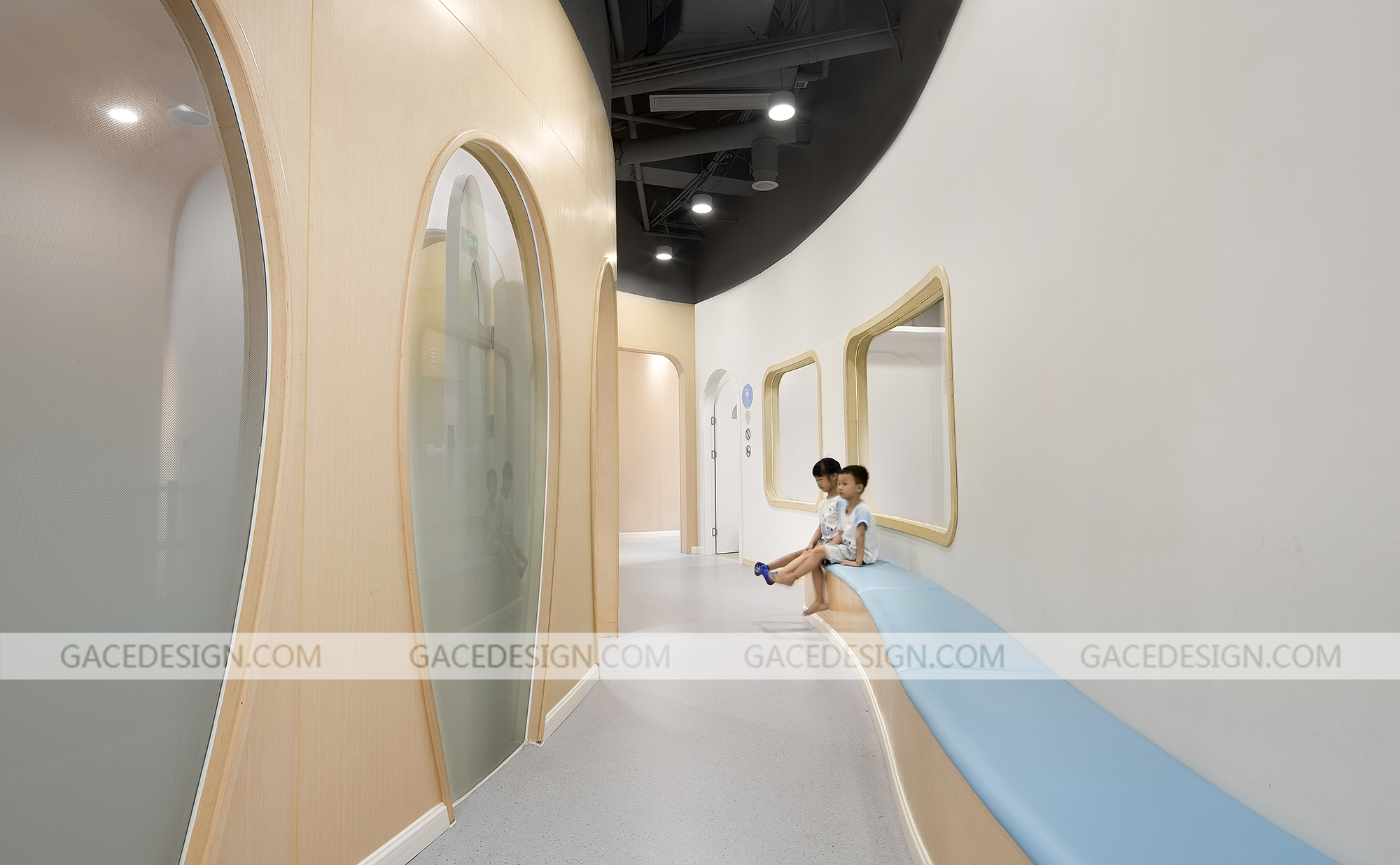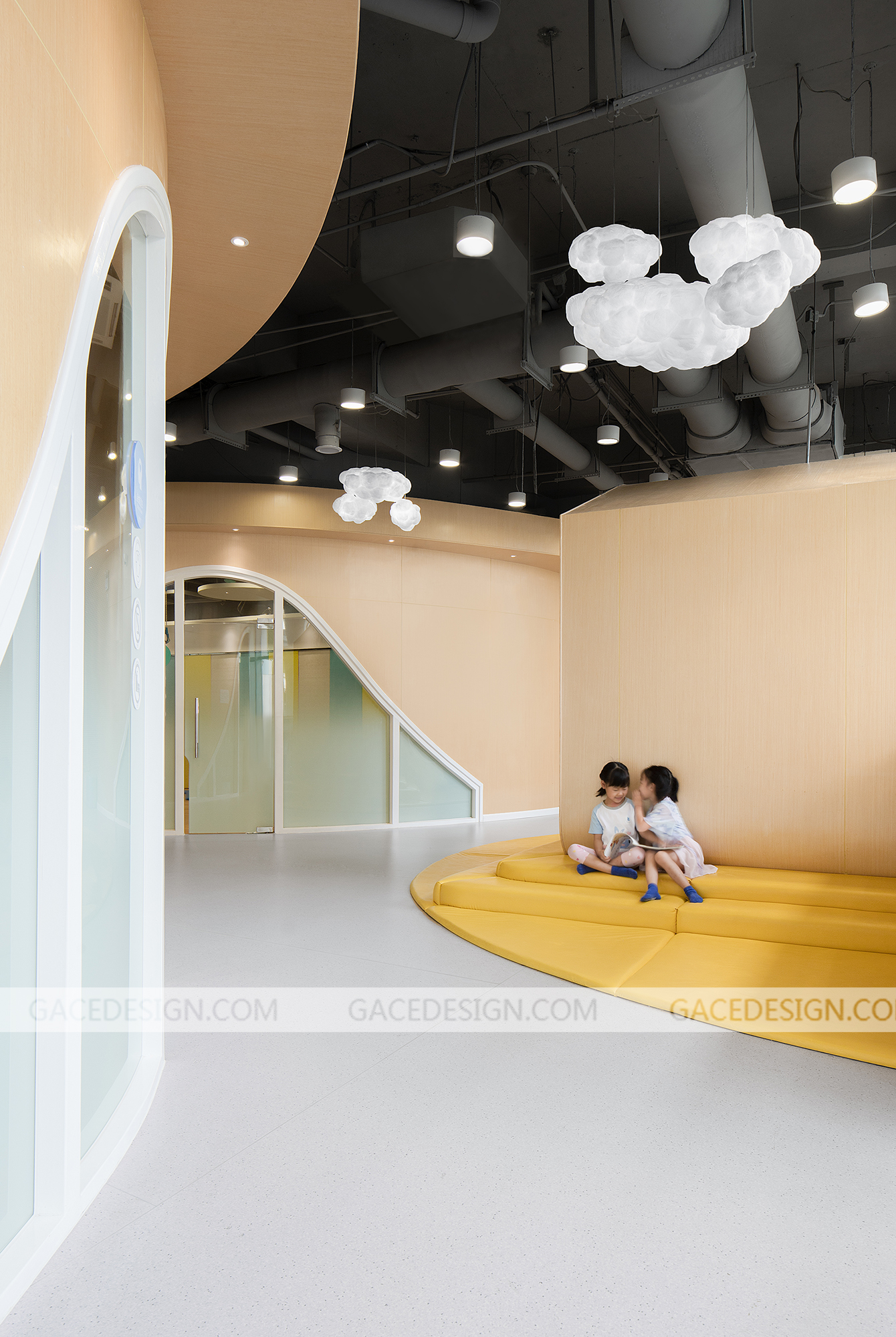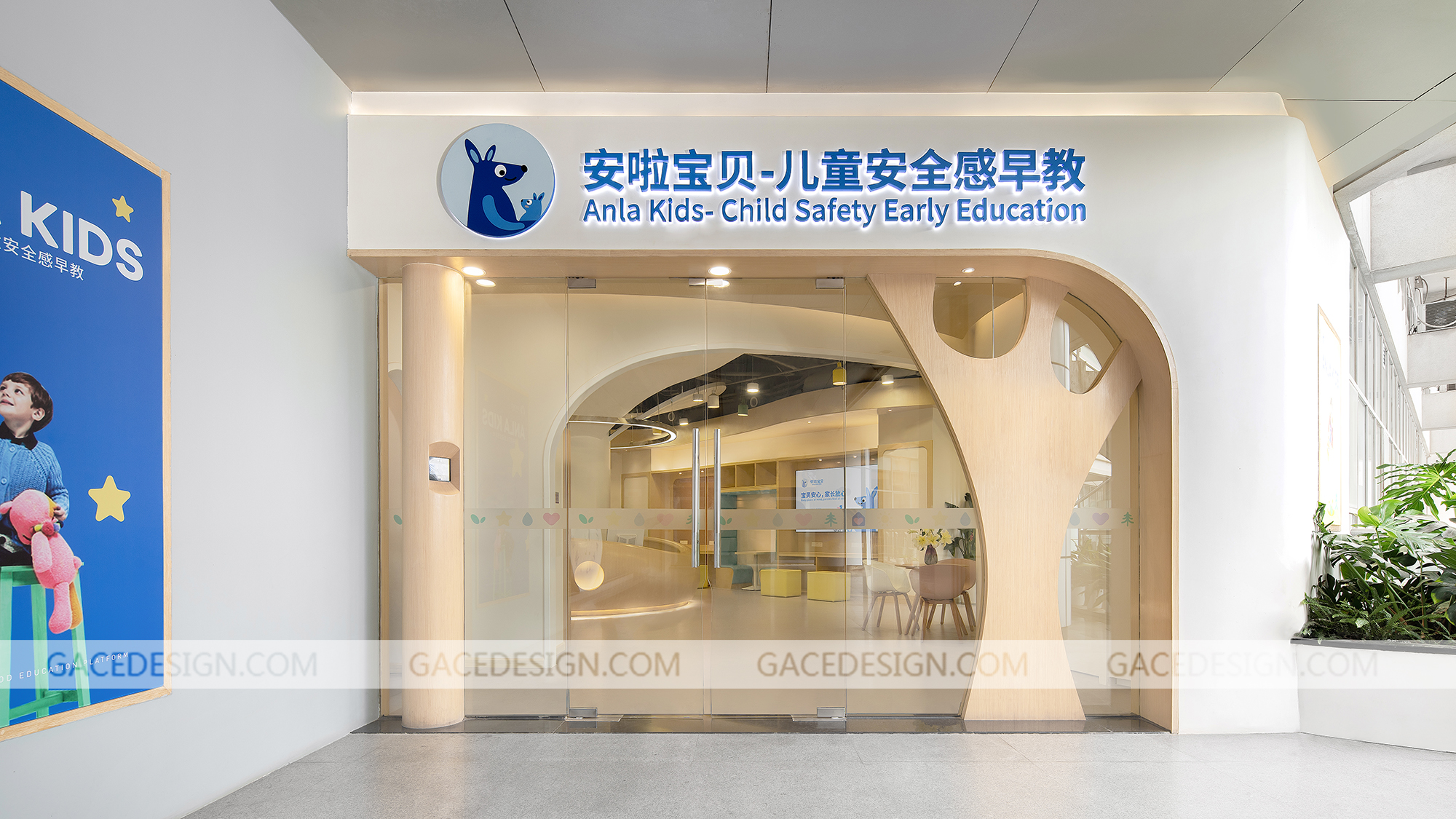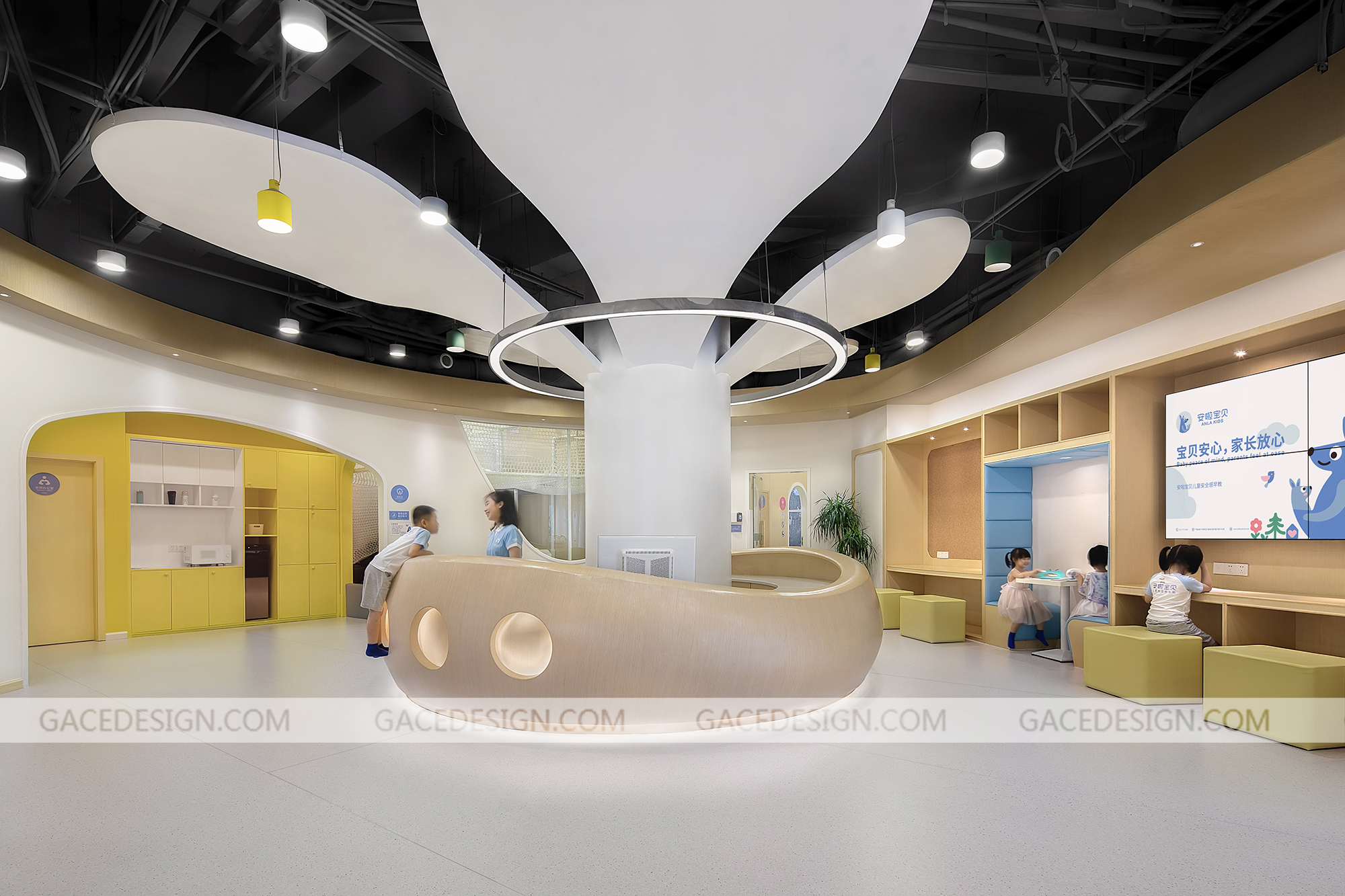安啦寶貝是一家專注于培養兒童安全感的教育機構,提供父母課堂培訓及兒童綜合評測服務,其創業者擁有13年豐富的行業經驗,多年來不斷在兒童發展心理學、NLP、薩提亞、家庭系統排列、靈性成長及傳統文化等領域中學習,探索,成長。安啦寶貝兒童安全感早教利用一個豐富多變的曲線將異形、多柱且零散的空間整合起來。這條曲線猶如一條彩帶,激活了整個空間,使其既完整,又多變,趣味盎然且動感十足。