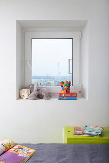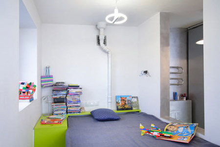 除了迎合兒童口味的亮麗色調外,室內還可以看到多處節省空間的精巧設計,如可以閉合的廚房&餐廳、位于門廳的浴室、便于儲物的墊高的床等,以滿足兒童對視野和活動空間的需求。