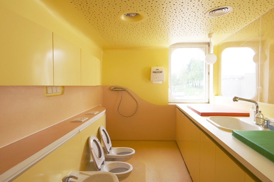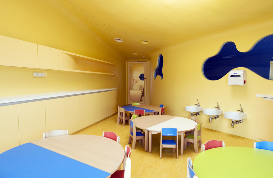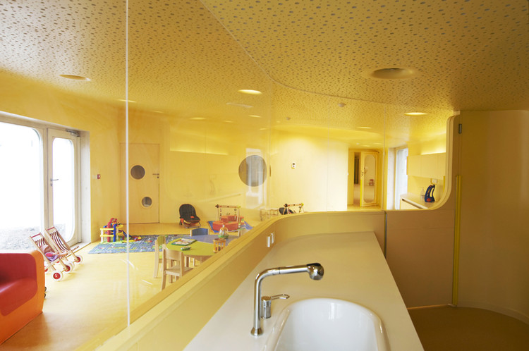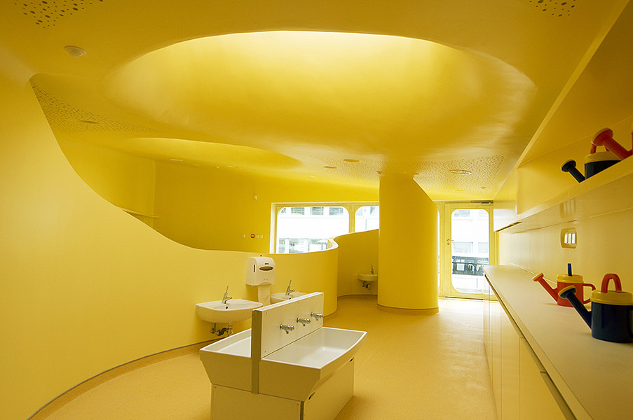 為了保證設(shè)施的安全,所以在內(nèi)部配件的設(shè)計中,消除了所有的直角結(jié)構(gòu),并提供平滑彎曲的邊緣,即使連鋒利的邊緣也被倒圓。這些是該建筑的特點之一,外墻像波浪一樣進(jìn)入了內(nèi)部空間。