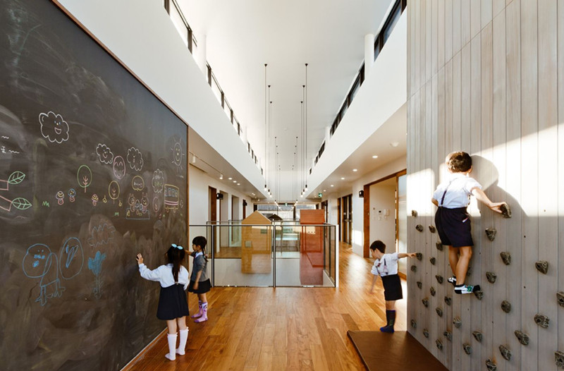 5.別總是擔心孩子受傷。過去家長們總是過分的擔心孩子受傷,然而此觀念近年來漸漸有所轉變,大家發(fā)現(xiàn)過分的保護將阻礙孩子的成長。通過設計處理好陽角等容易磕傷的地方,其余應該合理規(guī)劃材料的選擇,不能讓孩子從小就只知道墻壁是“軟的”。當然,保持幼兒園的整潔,避免孩子們的磕碰也是必要的。圖中設計,多個儲物櫃、收納盒、寬敞的教室、可以塗鴉的黑板。
