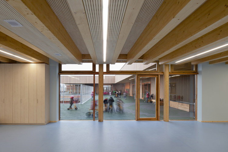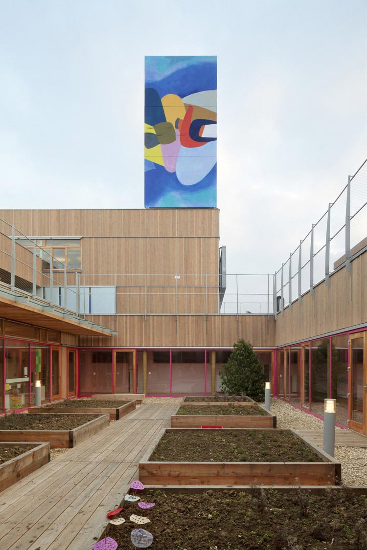 項(xiàng)目位于巴黎附近的Limeil-Brevannes,包括3個(gè)幼兒園、兩所小學(xué)和一座46套住房的公寓樓。這座規(guī)模較大的學(xué)校將傳統(tǒng)的教室結(jié)構(gòu)布局在中心庭院四周,共享餐廳和圖書館,但每座建筑都有自己的獨(dú)立空間。