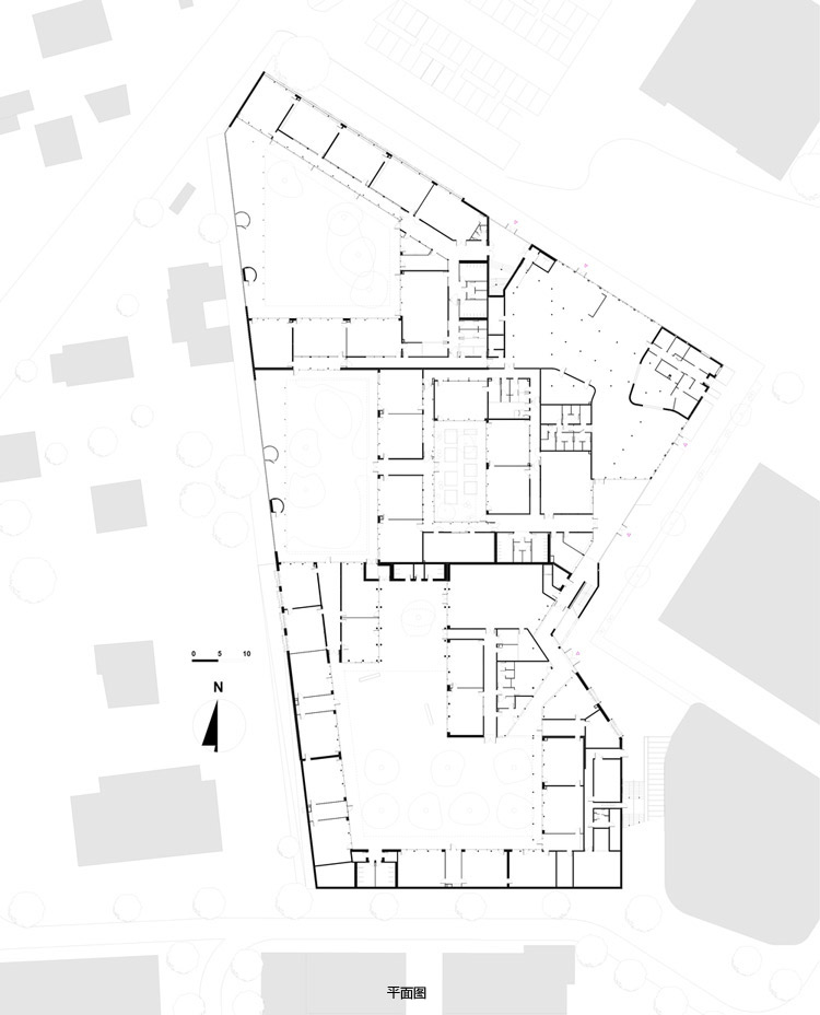 新大樓對(duì)重新定義未來(lái)的城市中心的都市空間有著重要意義。建筑北面是市政廳,南面正對(duì)公寓樓圍合的廣場(chǎng),西側(cè)是私人住宅。建筑師完善既有的零散城市空間,建設(shè)完整的都市空間。