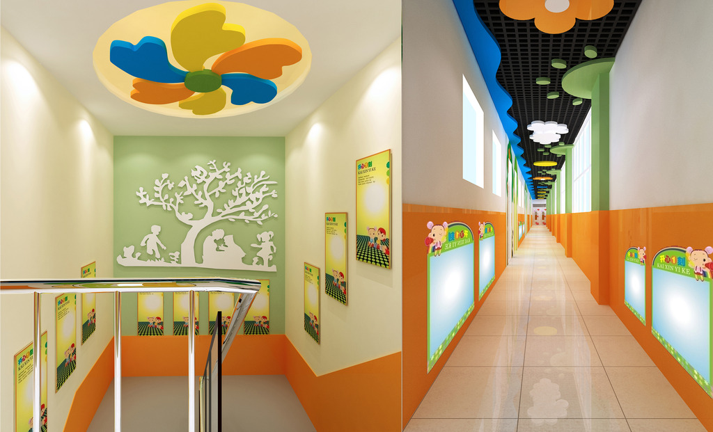 幼兒園裝修走廊要貫通一氣,盡量保證走廊的寬度在1.2米以上。邊上的圍欄最好是密封型的,高度不能低于1米。樓梯護欄在體現建筑特點上有一定的作用,因而在造型上要獨特,有幼兒園特點。可打破傳統的平直封閉形式,有凹凸變化,可按現代的平面來構成,增加圍欄的趣味性,也可以設計成上部分通透、下部分封閉的形式,但要防止幼兒攀爬兩邊墻面。