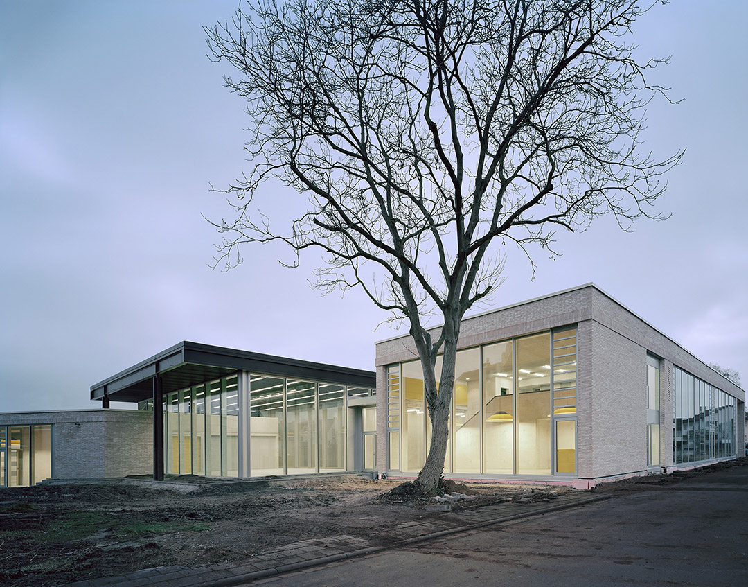 幼兒園中間的方體扭轉(zhuǎn)鏈接兩個(gè)不同方向的建筑,呈兩翼展開,在幼兒園室內(nèi)的空間有明細(xì)的規(guī)劃,1-3歲的30個(gè)小孩的日托空間布置在南側(cè),4–7歲100個(gè)小孩的日托空間布置在北側(cè)—這里每間教室的層高都是雙層,更衣間和壁柜放在屋子的后側(cè)。這兩翼建筑通過中間的扭轉(zhuǎn)方體連接,方體的功能是多功能房和餐廳。所有主要的房間都設(shè)置了落地玻璃窗,讓花園和周圍歷史環(huán)境一覽無余。