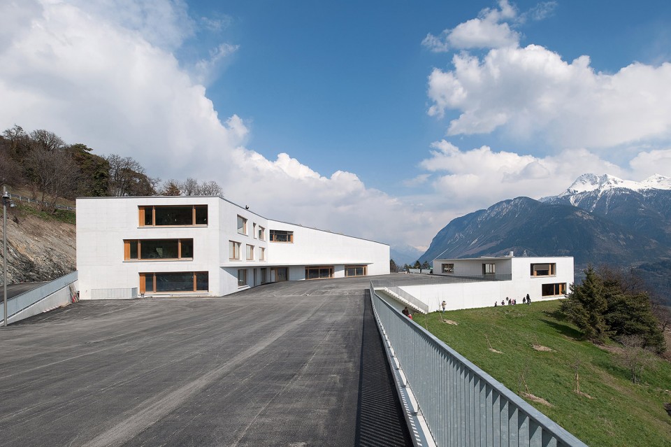 順應著山勢,學校和多功能廳互成角度地連接在一起。兩者位于同一屋檐下,極大地方便了小朋友們使用體育館。反之 當大廳內舉辦活動時,參與者也可以很便捷地使用學校的餐廳。兩層高的幼兒園位于南側稍低的地平上, 可以俯瞰整個山谷的美景非常壯觀。封閉的游樂場位于兩個樓層的中間平面上,方便到達和使用。