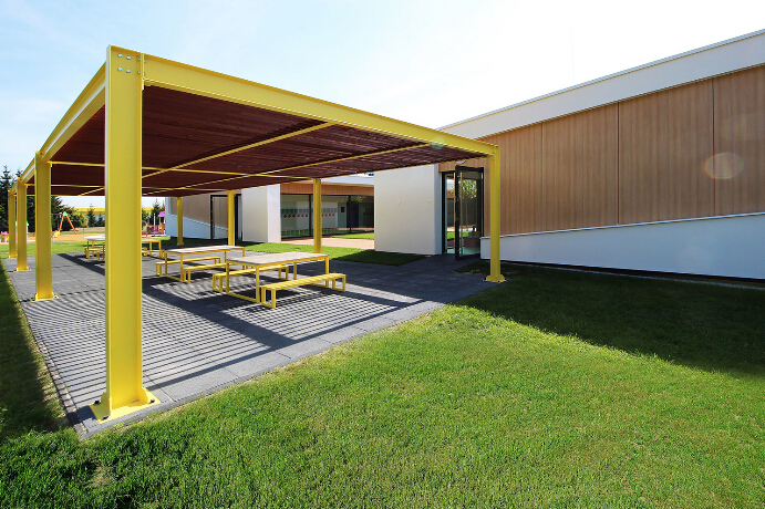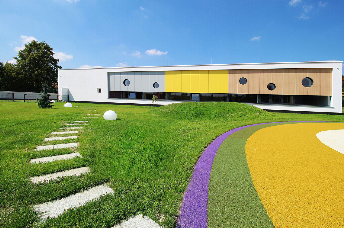 在波蘭的Yellow Elephant幼兒園坐落在一片綠色的草坪上,有著五間房間能夠容下一百三十多名孩子卻只有一層的幼兒園,由白、黃、綠、紫的顏色構(gòu)成的場地為孩子們提供了游戲場所。在藍(lán)天綠地的映襯下,這家幼兒園宛若一片置身于童話世界中的兒童樂園。