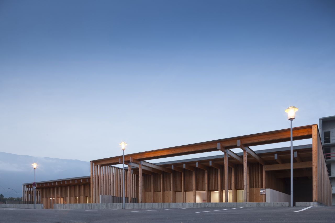 木材因生態(tài)與經(jīng)濟(jì)而被選中。作為自然而可再生的材料,它對健康沒有任何風(fēng)險,同時最大限度減少了碳排放。用于建筑的落葉松木可以采用高水平的預(yù)制,同時無論是建筑立面或其內(nèi)部結(jié)構(gòu)都不需要其他處理。北邊的木結(jié)構(gòu)和天井與混凝土相結(jié)合,從而保證最優(yōu)的保溫性能,同時尊重了防震需求。木結(jié)構(gòu)間充滿了粉刷與亞麻,從而獲得了高性能保溫墻體。建筑的密封性從早期研究到建筑工地都一直得到了重點關(guān)注。