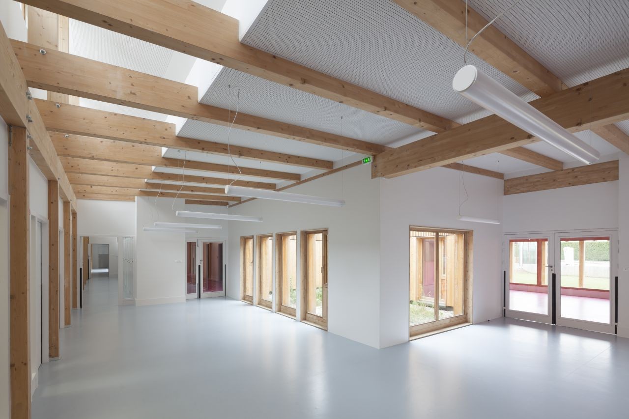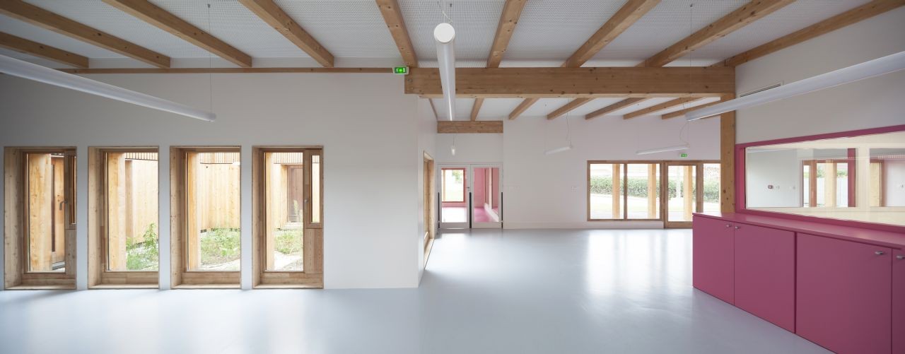 一所幼兒中心坐落在綠色而原始的圣格尼斯·普伊郊區(qū),緊鄰著日內(nèi)瓦與歐洲核子研究中心,并且正好位于法國與瑞士的邊界。在幼兒中心內(nèi)部,木結(jié)構(gòu)和自然光賦予空間以節(jié)奏。重復(fù)的結(jié)構(gòu)允許精確裝配細(xì)節(jié),因此這些細(xì)節(jié)也成為定義建筑室內(nèi)的元素。白色粉刷墻和帶有顏色提示的設(shè)施整合了孩子們的玩具與家具。體量和與線條的簡單與適當(dāng)?shù)谋壤m應(yīng)于孩子們的生活和視野,同時提供了寧靜而歡迎的設(shè)想,有意避免了任何“幼稚”的內(nèi)涵。