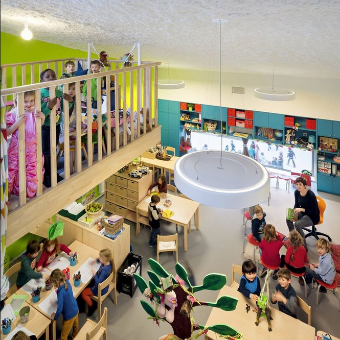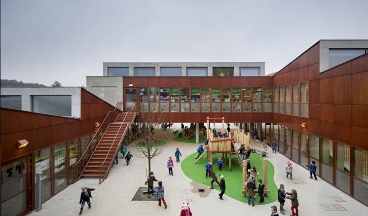 在老建筑和新學(xué)校建筑通過一個“回廊”相連。這個“回廊”位于院子周圍,提供通道可以進入所有房間。這個院子容納了操場。小學(xué)建筑也被保留。新老建筑結(jié)合的結(jié)果形成了令人興奮的安全的環(huán)境,適于小孩玩耍和學(xué)習(xí)。(幼兒園室內(nèi)設(shè)計)