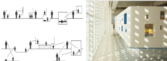 設計師首先考慮到兩種身高帶來的視角區別。因此在兒童內部空間中設計一些專供兒童使用的低矮空間。就如同我們小時候爬假山的山洞,或者拿沙發墊子搭的城堡。另一方面父母還必須負起監護的職責,所以主要活動室的設計升高到成人目光可以透過窗子平視的高度。這樣就更有利于家長觀察孩子的動向,設計師最終在大空間內部搭起一系列“小盒子”。呈現出升高的教室,供家長窺視的小窗,還有盒子底下只有孩子才能鉆過去的通道。我相信小孩們總會對這種特別的兒童空間設計感到興奮和安全感。