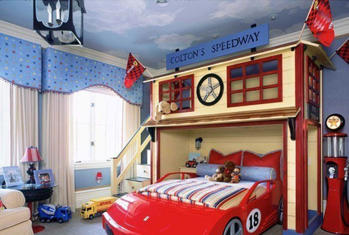 以汽車造型打造出的床和船造型由著異曲同工之妙,以汽車修理元素作為兒童房的主題,空間允許愛可以搭建一個二層小閣樓,這樣可以讓孩子在這里盡情的玩耍,天花板則是可以裝飾成天空色,抬頭仰望就可以在自己家的天花板上就能看到藍天白云,相信這樣的兒童房裝飾主題孩子一定會非常的喜歡。