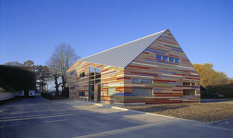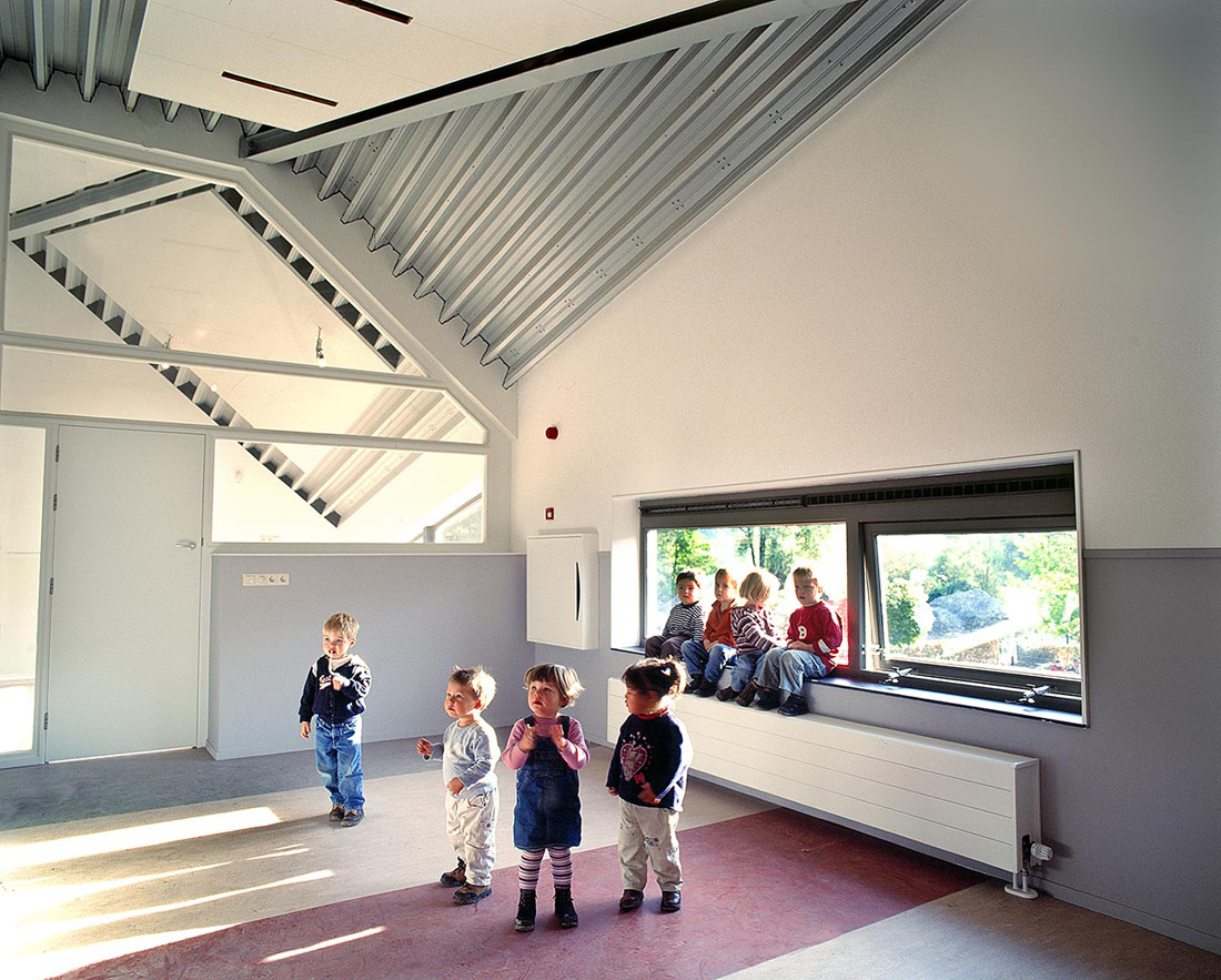 第二層是一個(gè)大大陽(yáng)臺(tái)是專門給孩子們活動(dòng)的,對(duì)于一層而言,陽(yáng)臺(tái)還能成為一個(gè)遮陽(yáng)罩。建筑一端尖形的屋頂與農(nóng)場(chǎng)的環(huán)境相協(xié)調(diào),而另一端是一個(gè)更為現(xiàn)代化的平頂,像是一個(gè)谷倉(cāng)。這樣的組合給整個(gè)建筑結(jié)構(gòu)一些不穩(wěn)定的、親切感。彩色木條紋和玻璃的運(yùn)用強(qiáng)調(diào)了這種感覺(jué),這是一座具有親和力的建筑,看起來(lái)像是兒童筆下的杰作,它一點(diǎn)也不雄偉,但卻充滿了夢(mèng)幻色彩。
